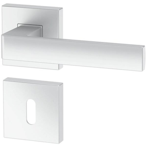 Mânere uși de calitate din aliaj usor AlZn în finisaj argintiu mat cu rozetă de cheie inclusă.