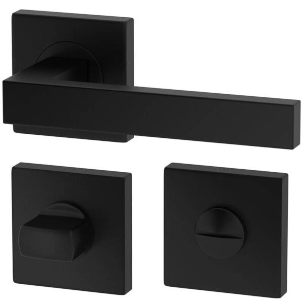 Mânere uși de calitate din aliaj usor AlZn în finisaj negru mat cu rozetele pentru wc incluse.