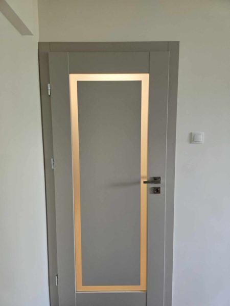 Ușile Laurencja sunt uși ramă – panou în versiunea cu falț. Atât rama canatului, cât și panourile sunt executate din MDF. Canatul este dotat cu sticlă mată securizată de 4 mm grosime. Canturile sunt protejate împotriva umezelii iar cantul superior este finisaj folosind tehnologia Toutchwood. Modelele sunt realizate fără garnituri de geam.